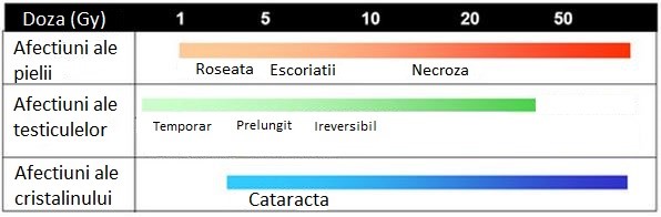 In cazul unei iradieri localizate acute, stim ca asupra unui organ (ex: pielea), la mai mult de 1Gy, pielea se inroseste. Pentru mai mult de 5Gy, pielea este arsa.